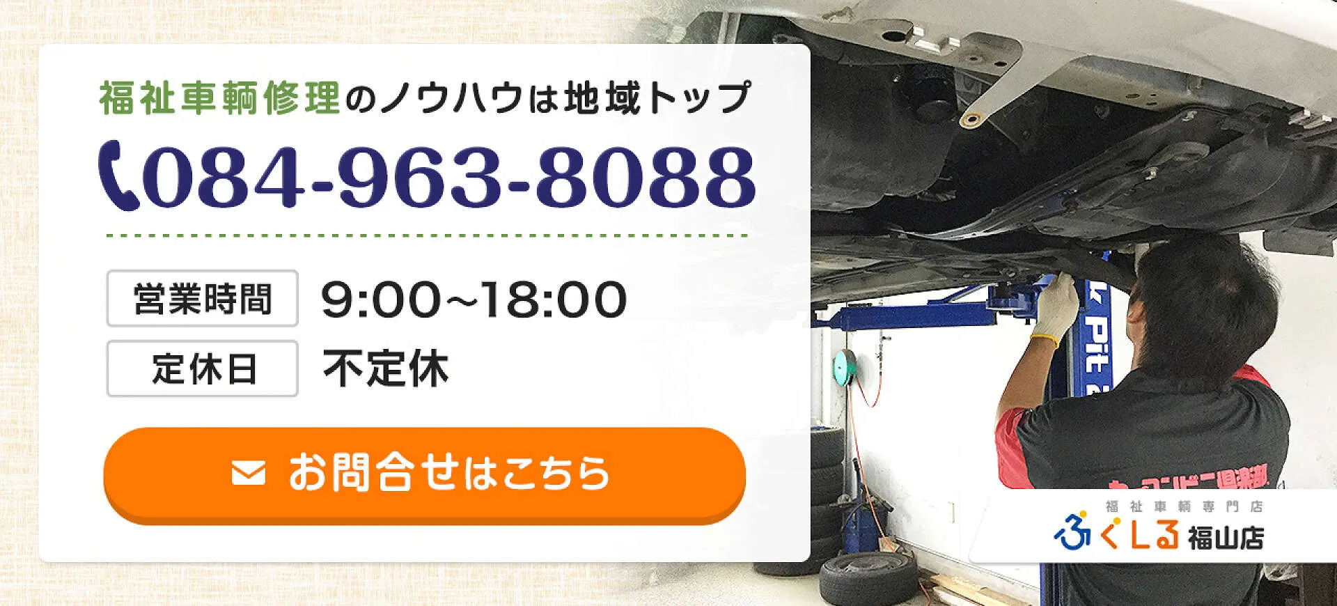 広島県福山市で福祉車輌の修理をお探しの方は、福祉車輌専門店のふくしる福山店にお任せください。地域密着型で介護サービス事業者のお客様から、介護・介助で福祉車輌をご利用されている個人のお客様まで、幅広くご利用いただいております。修理実績が豊富な熟練の整備士が一台一台丁寧に対応いたします。
