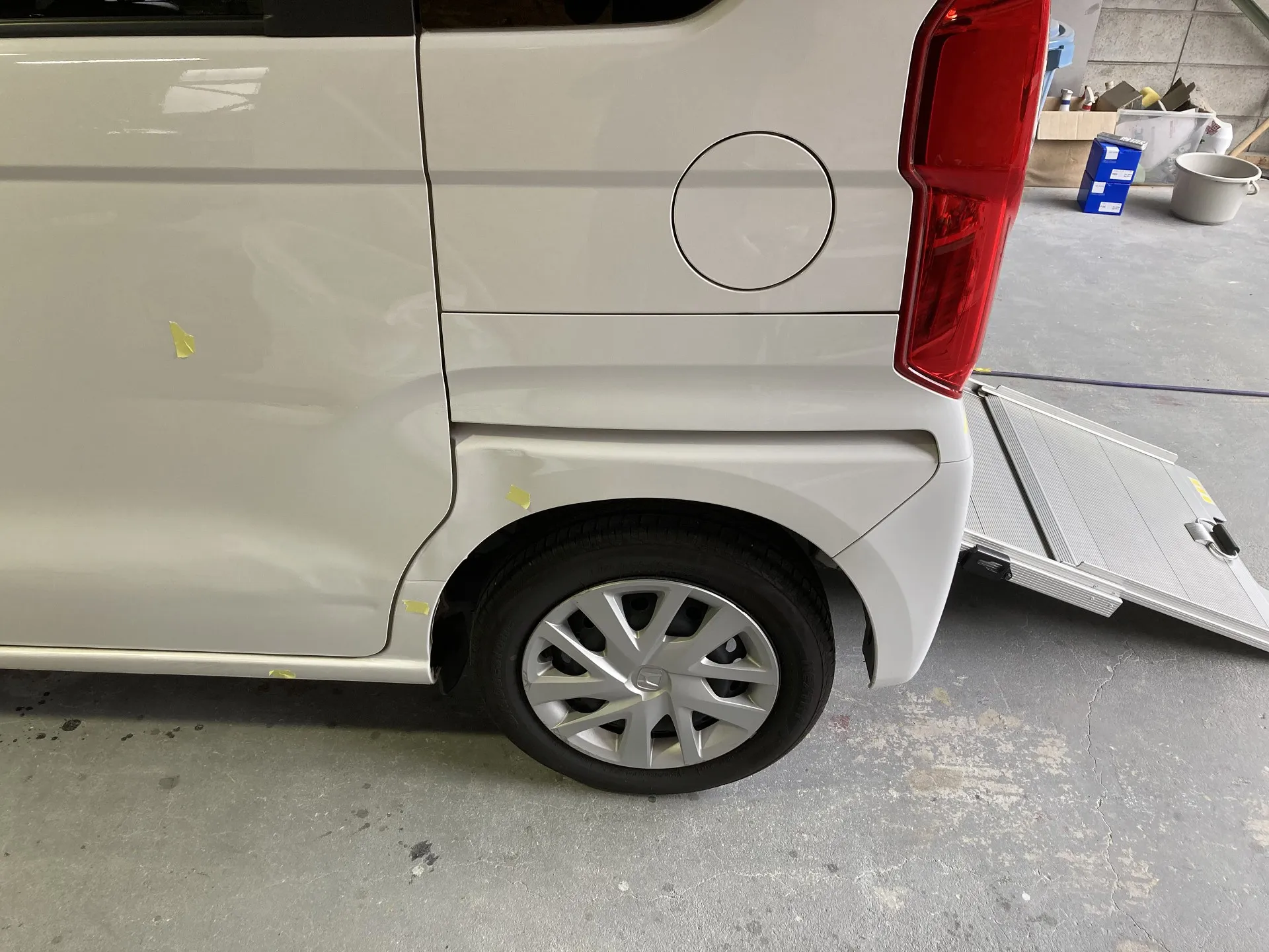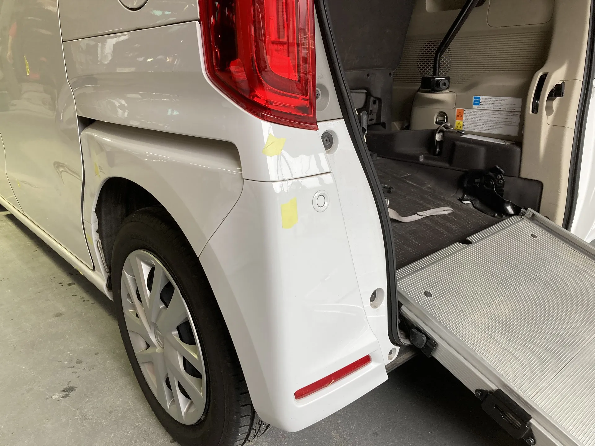 福山市にお住まいのM様より、福祉車輌のN-BOX、左ドア・リヤフェンダー、キズ・ヘコミ修理のご依頼をいただきました。