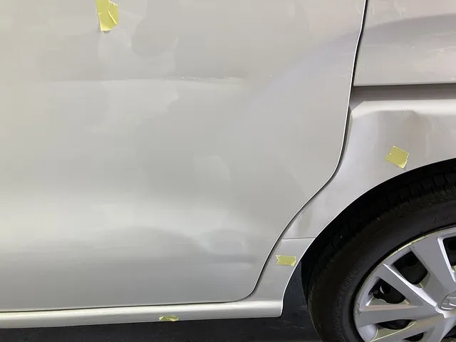 今回は、駐車場に停めていた際に他の車にぶつけられてしまった福祉車輌のキズ・ヘコミの修理です。軽くぶつかっただけなので、大事には至らなかったそうですが、ヘコミが目立ちますね。よく使う車なので、できるだけ早く直してほしいとのご要望でした。ご安心ください。当店は外注ではなく、全て自社で対応いたしますので、早く修理することができます。さっそく修理していきます。